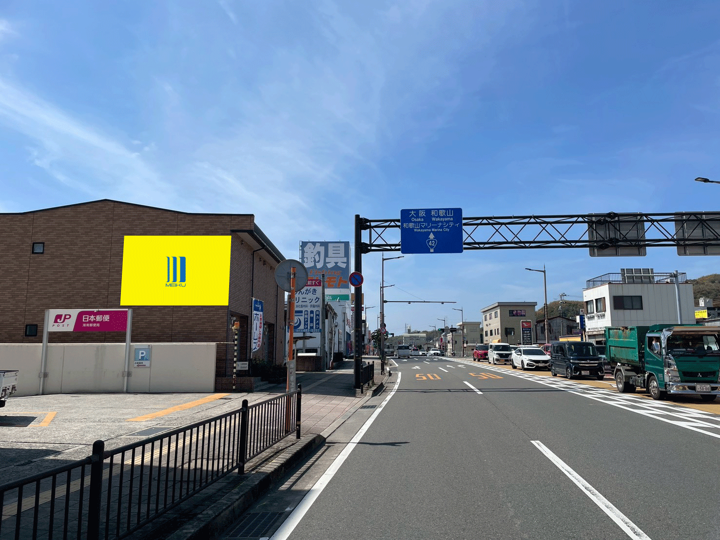海南市船尾、海南郵便局横に位置する壁面広告媒体です♪ 交通量の多い国道42号線沿いにあり、 船尾東交差点の信号待ち時にドライバーの視線をしっかり捉えます。